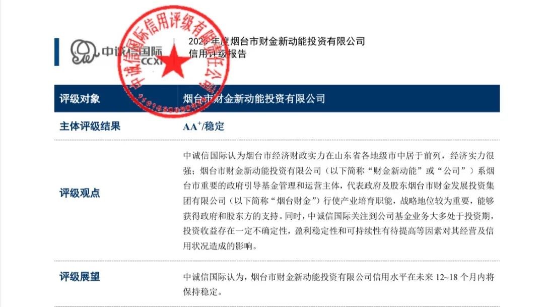 喜訊!煙臺財金集團旗下財金新動能公司成功獲評“AA+”主體信用評級
